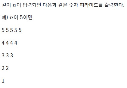 이번에는 역삼각형으로 * 대신 숫자가 나오는 코드를 작성하는 문제입니다. 아까 전과 비슷하게 짜보았습니다.