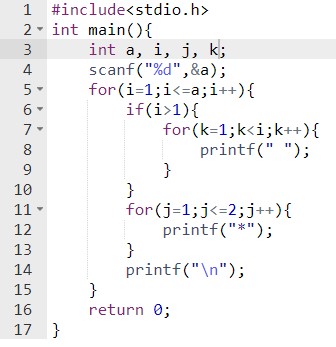 저는 이 문제를 보고 이런 코드를 짜보았습니다. 역삼각형이 출력할 수 있도록 사용했던 for문을 작성하였고, 한 줄에 *이 2개씩 출력하므로, j는 2보다 작거나 같을 때까지 반복하는 반복문을 사용하였습니다.
