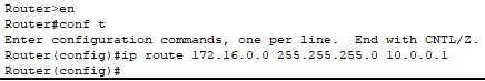 Router(config)#ip route 172.16.0.0 255.255.255.0 10.0.0.1