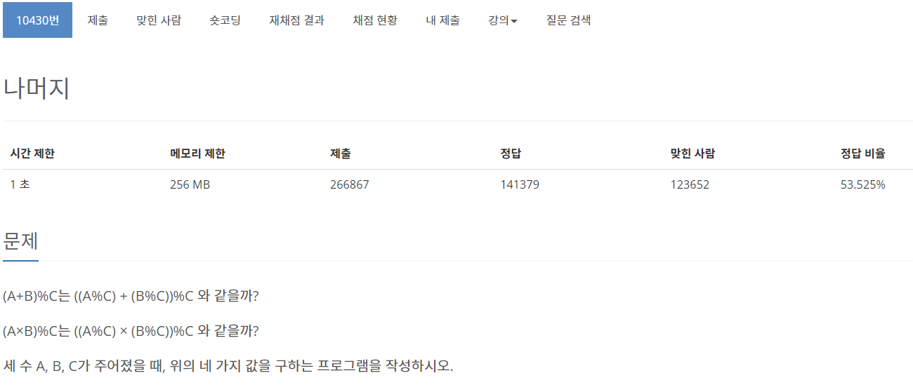 printf("%d\n%d\n%d\n%d",(a+b)%c,((a%c)+(b%c))%c,(a*b)%c,((a%c)*(b%c))%c);